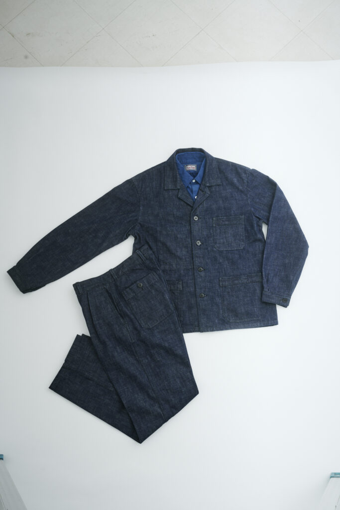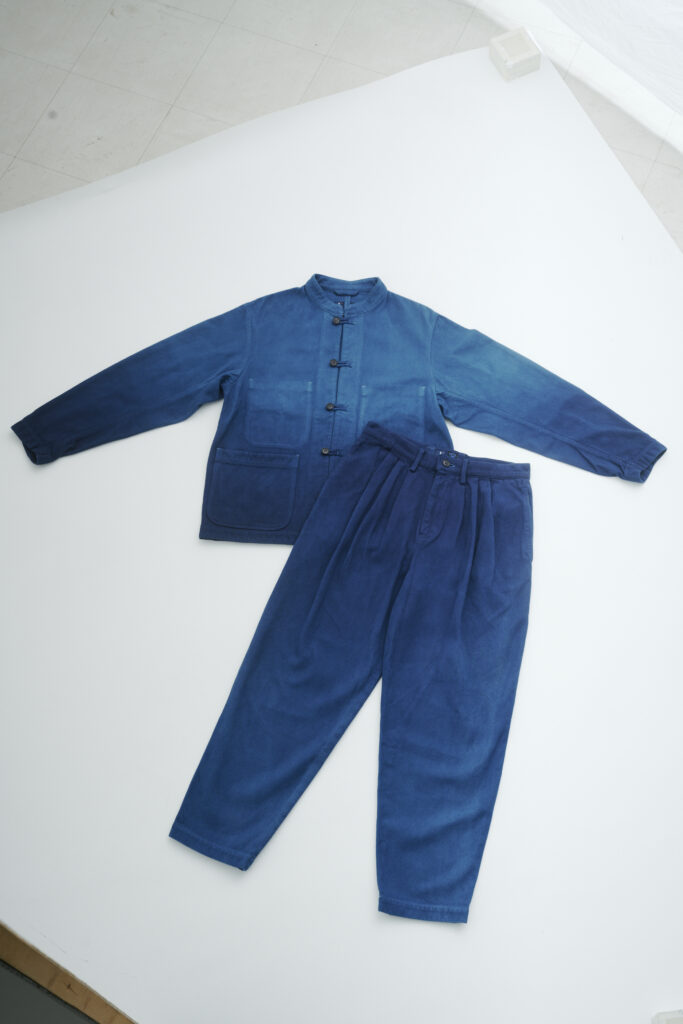 本藍染師・中西秀典氏が主宰する本藍染雅織工房にて、手仕事により染め上げ、織られた天然本藍セルビッヂデニムを採用し、ブルーブルーの象徴であるカバーオールやワークパンツを製作。セットアップのシャツも、打ち込みのいいコットンを天然本藍で染め上げた特別な仕上がり。