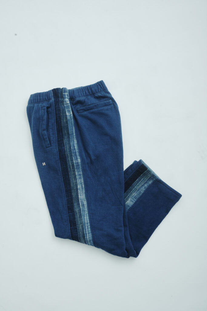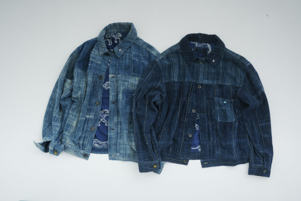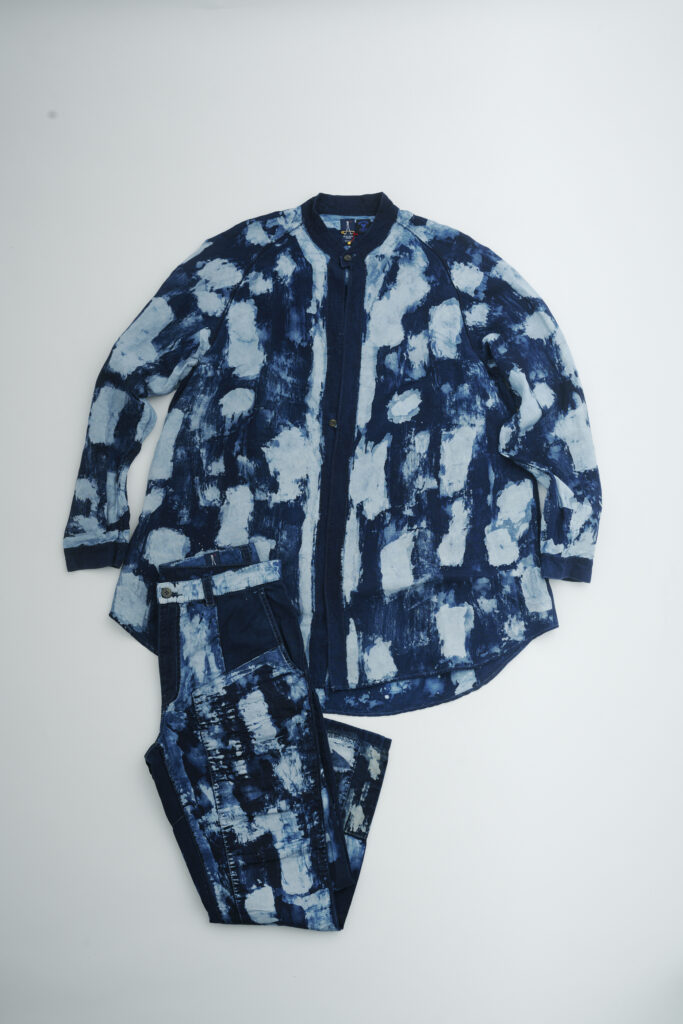 西アフリカ・モシ族が織り上げた藍染木綿の古布を用いたパッチワークのトラッカージャケットをはじめ、本藍染師・中西秀典氏によって染め上げられた再構築したシャツやトラックパンツ、さらに廃材やビーチグラスを素材にしたアクセサリーがラインナップ。