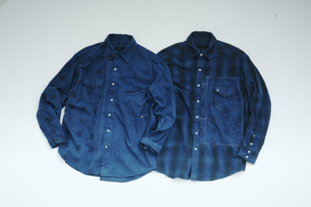 《ブルーブルー》と《ハリウッドランチマーケット》では、京都・山科を本拠地に江戸時代からの天然灰汁醗酵建藍染を継承し、本藍染雅織工房を主宰する本藍染師・中西秀典氏とのジョイントワークで、手仕事による100パーセント天然のスペシャルな本藍シリーズを製作。